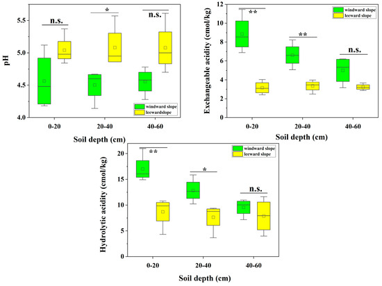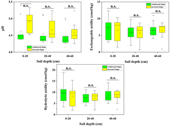 For the different depth soils in DLS, the mean values of pH for the windward slope and leeward slope soils were 4.62 and 4.91 at 0–20 cm; 4.54 and 4.66 at 20–40 cm; and 4.48 and 4.58 at 40–60 cm, respectively. The mean values of exchangeable acidity for the windward and leeward slopes by soil depth were 7.00 and 6.54 cmol/kg at 0–20 cm; 5.78 and 5.76 cmol/kg at 20–40 cm; and 6.76 and 6.46 cmol/kg at 40–60 cm, respectively. The mean values of hydrolytic acidity for the windward and leeward slopes by soil depth were 9.73 and 8.24 cmol/kg at 0–20 cm; 7.46 and 7.45 cmol/kg at 20–40 cm; and 8.46 and 8.19 cmol/kg at 40–60 cm, respectively. There were no significant differences in mean soil pH, mean exchangeable acid, and hydrolytic acidity between different slope directions (windward and leeward slopes). However, for mean values, soil pH was lower on windward slopes than on leeward slopes, and the contents of exchangeable and hydrolytic acidities were higher on windward slopes than on leeward slopes (Figure 8).