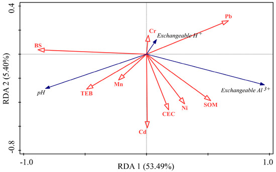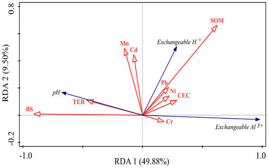 Redundancy analysis (RDA) was used to study the relationship between soil acidity indexes and soil physicochemical properties. The DLS data showed that the cumulative explained variances of the first and second axes were 49.88% and 9.50%, respectively, and the total explained variance was 59.38%. The main environmental factors affecting soil acidity index were BS and SOM. Soil pH showed a strong positive correlation with BS. Soil pH showed negative correlations with active state Cr, Ni, and Pb and positive correlations with the remaining metals (Supplementary Table S7) (Figure 10).
