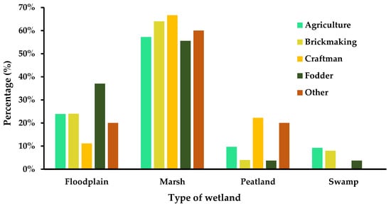 To assess the services provided by wetlands to the community, we first identified the types of usage of these areas by the communities. This was followed by perception of these WESs. Initially, we found a dependency between the type of use and the four types of wetlands found in South-Kivu (χ2 = 47.9, df: 12, p < 0.001). Figure 3 showed that agriculture remained the main dominant activity (65%) in wetlands (except for peatlands), followed by brick making (15%), artisanal activities, forage harvesting, and various other activities. Although they are less represented, few activities are observed in swamps. These activities are more observed in marshes and floodplains/inland valleys than in swamps and peatlands. With few activities, swamps remain the type where less anthropogenic pressure is seen.