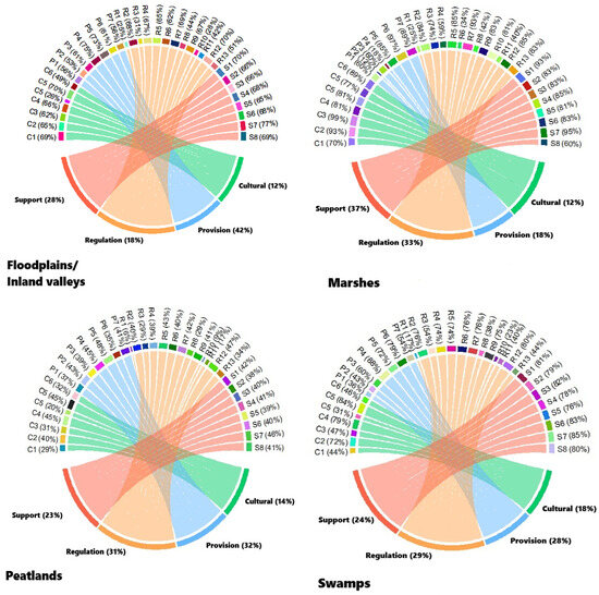 Categories of ecosystem services (ESs) reported for the four wetland types in South-Kivu province in eastern DR Congo (C1 to C6, S1 to S8, R1 to R13, and P1 to P7 present the questions used to assess cultural, supporting, regulating, and providing WESs, respectively). These questions are presented in the Table S1, Figure S2 and are available at the link (https://ee.kobotoolbox.org/x/fYETA7Fe, accessed on 20 May 2024).