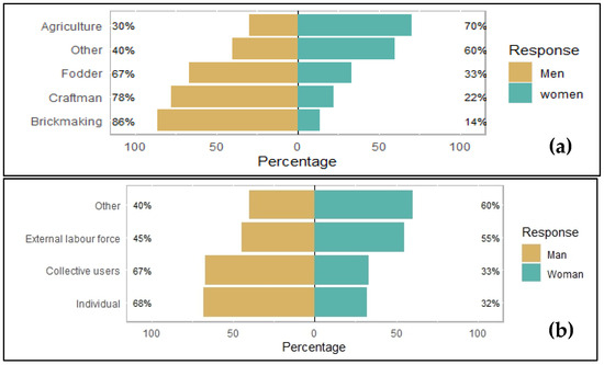The analysis conducted between the type of activity carried out in wetlands and gender, as well as the source of labor, showed a strong dependence between the main type of activity (χ2 = 12.34, df = 4, p = 0.023), the type of labor (χ2 = 17.4, df = 3, p = 0.001), and gender. These analyses showed that men are focused on activities that generate quick income, such as brick making and artisanal activities (making chairs, mats, pots, etc.), in addition to agricultural activities than women. A very small proportion of women participate in brick making and artisanal activities in wetlands (Figure 6a). According to field discussions and observations, these women are either involved in selling bricks (mainly made by their husbands or acquaintances) or working as laborers transporting bricks from the place of manufacture to the place of firing or sale. Since women seemed to be mainly involved in labor activities, we also analyzed the source of this labor used by gender. It appears that men carry out their own activities in 68% of cases, compared to 32% for women (Figure 6b). These men also use collective labor (87%), meaning family members or external labor. Regarding labor outside the household, women (55%) and men (45%) both rely on this type of labor.