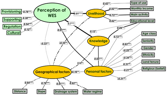 Driving factors of perception of wetland ecosystem services in South-Kivu, eastern DR Congo. The plot was produced following the SEM (Structural Equation Model) analysis of wetland ecosystem services (WESs) perceptions; *, **, and *** indicate the significance at the level of 5%, 1%, and 0.1% threshold, respectively. Dashed lines indicate a non-significant loading path, while the width represents the strength of the relation.
