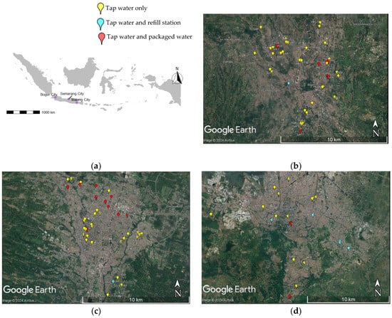 Study areas. (a) Locations of the study areas: (b) Bogor City, (c) Malang City, and (d) Semarang City. Yellow points indicate the sampling sites for tap water only; light blue points indicate sampling sites for tap water and refill stations; and red points indicate sampling sites for tap water and packaged water. Some dots are overlapped due to close proximity.