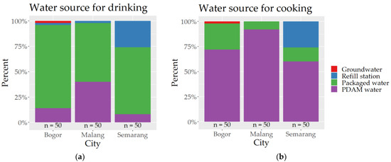 Figure 2 shows the water sources for drinking and cooking in the three cities. The majority of the respondents in the three cities use packaged water for drinking (Figure 2a), namely 82% in Bogor, 58% in Malang, and 66% in Semarang. Most of the households use 19-L polycarbonate packaged water and store them in a water dispenser or use a mini-water pump to serve the water for drinking. Additionally, 14% of the respondents in Bogor, 40% of the respondents in Malang, and only 8% of the respondents in Semarang use PDAM water as their drinking water source, while 26% of Semarang residents use refill station water. Water refill stations are small businesses that sell treated water. Customers bring their own containers (usually a 19-L polycarbonate bottle), and the stations clean the bottles and fill them. Some stations offer to pick up empty bottles and deliver refilled ones to the customers’ homes. The total percentage of households who drink PDAM water in the three cities is 21%. Households that use PDAM as their drinking water source always boil the water before consumption. The majority of the households in Bogor (72%) use PDAM water for cooking, while 26% use packaged water (Figure 2b). Furthermore, 92% of the households in Malang and 60% of the households in Semarang use PDAM water for cooking, while 26% use refill station water, and 14% use packaged water.