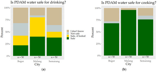 Households’ answers to the questions (a) “Is PDAM water safe for drinking?” and (b) “Is PDAM water safe for cooking?”.