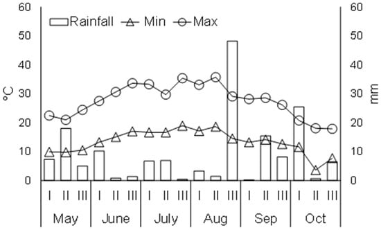 Air temperatures (minimum and maximum) and rainfall on a ten-day basis during the growing season; I, II, and III indicate the first, second, and third ten-day periods in each month.