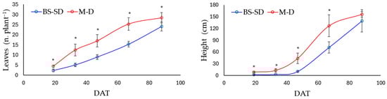 Leaves (n plant−1) and stem heights (cm) of the tobacco plants grown under two crop management systems. Data are shown as means ± standard deviations of three replications. BS-SD, bare soil–sprinkler/drip irrigation; M-D, mulching–drip irrigation; DAT, days after transplanting. *, significant at p < 0.05.