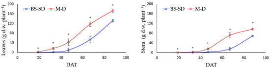 Leaf and stem biomasses (g d.w. plant−1) accumulated by tobacco plants grown under two crop management systems. Data are shown as the means ± standard deviations of three replications. BS-SD, bare soil–sprinkler/drip irrigation; M-D, mulching–drip irrigation; d.w., dry weight; DAT, days after transplanting. *, significant at p < 0.05.