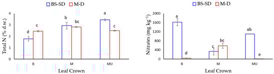 The results of the total N and nitrate contents of the cured leaves belonging to the basal (B), middle (M), and middle-upper (MU) leaf crowns are reported in Figure 4. The M-D system significantly increased the total N content of B leaves, while it decreased that of MU leaves (Figure 4). However, no difference between the M-D and the BS-SD management systems emerged in the leaves belonging to the M crown (Figure 4).