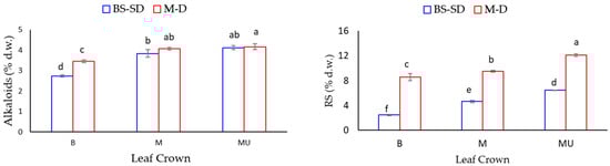 The M-D system significantly increased the alkaloid content in B leaves (Figure 5). By contrast, no difference due to different crop management systems emerged in the leaves belonging to both the M and MU crowns (Figure 5). Reducing sugars changed markedly with the two crop management systems, with significantly higher values under the M-D conditions than the BS-SD conditions and with a significant increasing behavior from the B to MU crowns under both the M-D and BS-SD conditions (Figure 5).