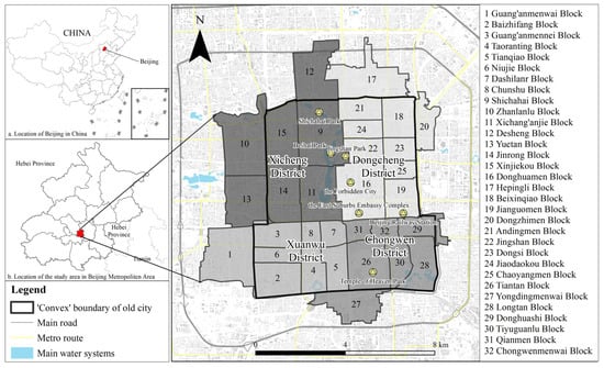 Beijing is located at longitudes 115.7°–117.4° E and latitudes 39.4°–41.6° N, encompassing an area of approximately 16,410.54 km2. The study area selected for this paper is the central area of Beijing, as shown in Figure 1. Specifically, it includes the Dongcheng and Xicheng Districts, established following the 2010 adjustment of Beijing’s administrative divisions, which consolidated the original Dongcheng, Chongwen, Xuanwu, and Xicheng Districts (See Figure 1). These districts form the central area for the protection of Beijing’s historical and cultural heritage and the core functional area of the capital, as delineated in the Beijing Main Functional Areas Plan. This central area covers 32 blocks and an area of 92.39 km2.