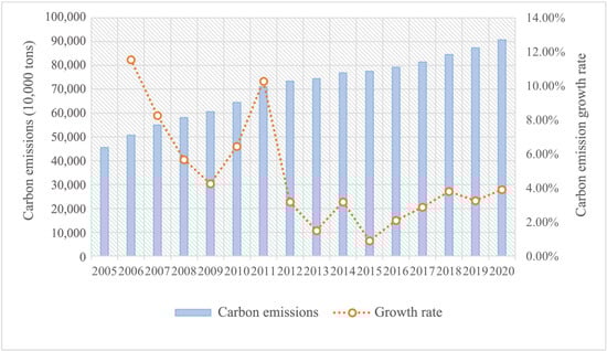 Trend of total carbon emissions in Jiangsu Province from 2005 to 2020.