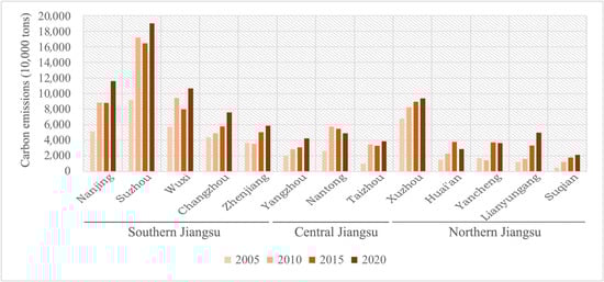 As shown in Figure 2, the carbon emissions of various prefecture-level cities in Jiangsu Province increased year by year from 2005 to 2020. The carbon emissions in southern Jiangsu account for about 60%, with an average annual growth rate of 4.31%. The proportions of carbon emissions in central and northern Jiangsu are about 15% and 25%, respectively, with average annual growth rates of 6.21% and 6.41%. The main reason for the differences among the three major regions is that the high-energy-consuming industries, urbanization level, and economic development in southern Jiangsu are more developed than those in central and northern Jiangsu. Suzhou has had the highest carbon emissions over the years, about eight times those of Suqian, but its annual growth rate is relatively low. Suqian has had the lowest carbon emissions in the province over the years, but its annual growth rate is the highest.