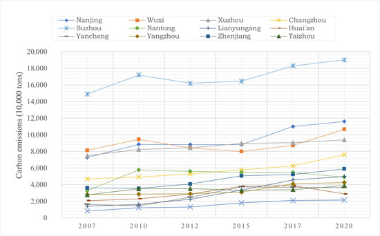 Trends of carbon emissions in 13 prefecture-level cities in Jiangsu Province from 2005 to 2020.