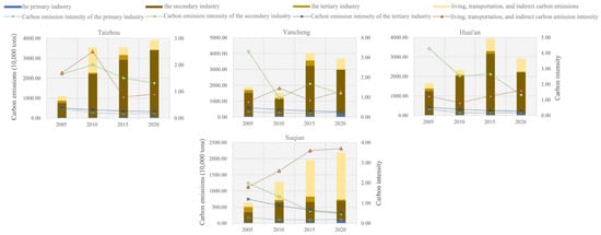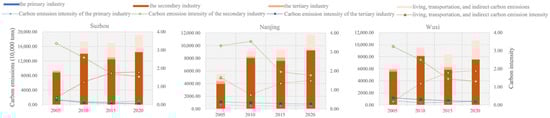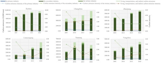 Except for Suqian (28%), the proportions of carbon emissions from the secondary industry in various prefecture-level cities are very high, all exceeding 60%. In addition, the carbon emission intensities of the secondary industry in Xuzhou and Zhenjiang are relatively high, at 2.9 tons/10,000 CNY and 2.8 tons/10,000 CNY, respectively. The secondary industry is a key area for carbon reduction in these two prefecture-level cities.
