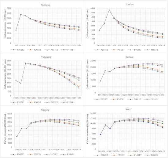 Based on the regression results of the STIRPAT model, four different scenarios were set up to predict the carbon emissions of various prefecture-level cities in Jiangsu Province from 2021 to 2030. In the high-growth, slow-consumption scenario (P1G1E1), the rapid development of the economy and society has led to a significant increase in carbon emissions, while the slow improvement in the technological level has slowed down the rate of carbon reduction, and the rate of carbon peaking in various prefecture-level cities is very slow. In the high-growth, fast-consumption scenario (P1G1E2), the rapid development of the economy and society has led to an increase in carbon emissions, and the rapid improvement in the technological level has promoted the rate of carbon reduction. The carbon peak in various prefecture-level cities depends on the balance between the two. In the low-growth, slow-consumption scenario (P2G2E1), the slow development of the economy and society leads to the slow growth of carbon emissions, and the slow improvement in the technological level slows down the rate of carbon reduction. The carbon peak in various prefecture-level cities depends on the balance between the two. In the low-growth, fast-consumption scenario (P2G2E2), the slow development of the economy and society has led to the slow growth of carbon emissions, while the rapid increase in the technological level has increased the rate of carbon reduction, and the rate of carbon peaking in various prefecture-level cities is very fast.