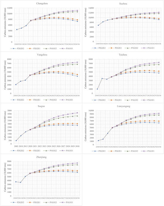 Changzhou, Xuzhou, Yangzhou, Taizhou, Suqian, Lianyungang, and Zhenjiang are all able to achieve carbon peak between 2025 and 2029 under the low-growth, slow-consumption scenario (P2G2E1) and low-growth, fast-consumption scenario (P2G2E2), but they cannot achieve carbon peak before 2030 under the high-growth, slow-consumption scenario (P1G1E1) and high-growth, fast-consumption scenario (P1G1E2), as shown in Figure 8. The average peak emissions of these seven prefecture-level cities under the four scenarios are 85 million tons, 100 million tons, 49 million tons, 51 million tons, 66 million tons, 67 million tons, and 29 million tons, respectively. These seven prefecture-level cities are still in a stage of rapid economic growth and have taken on carbon-intensive industries transferred from developed cities; thus, it will be difficult for them to achieve carbon peak first.
