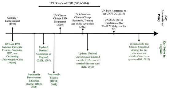 Climate change and sustainability education policy in England has varied significantly in response to government ideology, and more broadly in the last 30 years, with less apparent influence from the international policy context. Since the 1990s, devolution of the home nations of the United Kingdom of Great Britain and Northern Ireland (UK) has meant that each jurisdiction has the authority to develop and govern their own public services; consequently, England, Northern Ireland, Scotland, and Wales determine their own education policy, including national curricula. Here we focus on England, although it should be noted that in Scotland, Learning for Sustainability is an entitlement for all children and young people and is embedded into the Professional Standards for Teachers [9], and in Wales, the broader field of Education for Sustainable Development and Global Citizenship (ESDGC) has long been recognised as a priority for the Welsh government [10].
