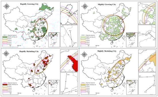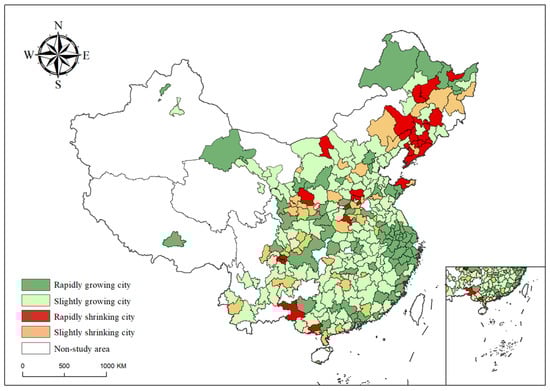 Based on research, we divided cities into the following four groups: (1) rapidly growing cities (RGCs), UDD ≥ 0.05; (2) slightly growing cities (SGCs), 0 ≤ UDD < 0.05; (3) rapidly shrinking cities (RSCs), UDD < −0.02; (4) slightly shrinking cities (SSCs), −0.02 ≤ UDD < 0.