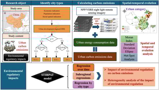 China, being the largest developing country globally, has produced substantial carbon emissions throughout its rapid growth. With the goal of addressing climate change and promoting sustainable development, the Chinese government has set a target to reach peak carbon emissions by 2030 and achieve carbon neutrality by 2060 [1]. Existing studies show that in China, more than 80% of carbon emissions come from cities [2], so controlling urban carbon emissions is the key to achieving carbon reduction targets. As China faces uneven regional economic development and urbanization, urban growth and contraction occur in certain regions [3,4], the issue of carbon emissions in these cities is often neglected. So it is necessary to explore the carbon emission characteristics and carbon reduction paths of shrinking and growing cities to realize the “dual carbon” goal. Environmental regulation, as an important influence on carbon emissions, plays an important role in promoting low-carbon development in Chinese cities, and the environmental regulation system has become complex and multilayered after almost 50 years of development [5]. Strengthening environmental regulation has become one of the most important ways to promote low-carbon development in Chinese cities. Therefore, the primary goal of this study was to clarify the spatial-temporal evolution characteristics and environmental regulation effects of carbon emissions in shrinking and growing cities.