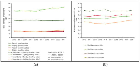 Temporal trends of carbon emissions in growing and shrinking cities from 2012–2021. (a) Temporal trends of total carbon emissions. (b) Temporal trends of average carbon emissions.
