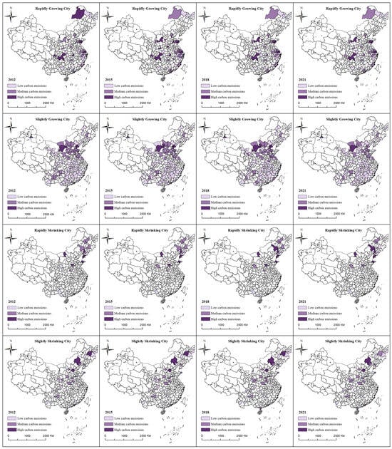 Spatial distribution patterns of carbon emissions in growing and shrinking cities from 2012–2021.