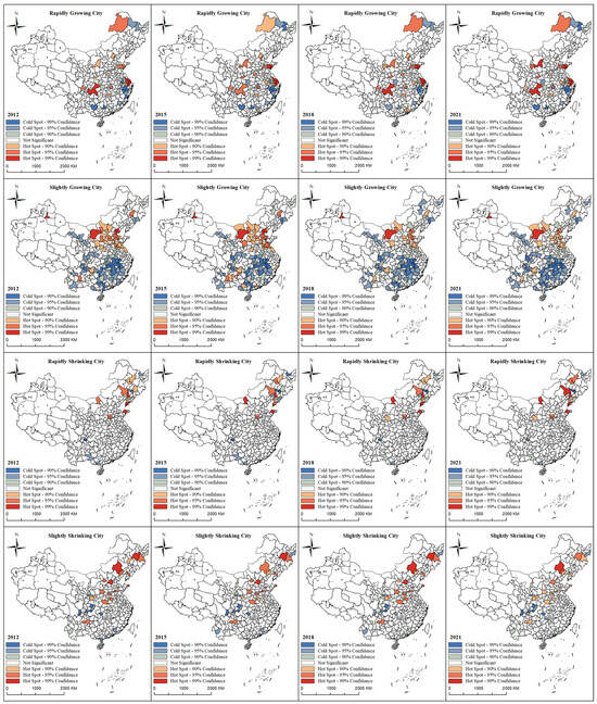 The hot and cold spot distribution features of carbon emissions in RGCs, SGCs, RSCs, and SSCs are displayed in Figure 5. Carbon emission hotspot areas of rapidly shrinking and growing cities were concentrated in the eastern coastal areas (i.e., mainly in Shandong and Jiangsu provinces). Carbon emission hotspots of SSCs were concentrated in North China (i.e., mainly in Hebei, Shandong, Shanxi, and other provinces), and cold spots were located in South China (i.e., concentrated in Hunan, Jiangxi, Fujian, and other provinces). The carbon emission hotspots of RSCs were located in Northeast China, whereas those of SSCs were mostly located in Northeast China and some were located in North China. The carbon emissions of RGCs, SGCs, RSCs, and SSCs in China exhibited local spatial autocorrelation characteristics.