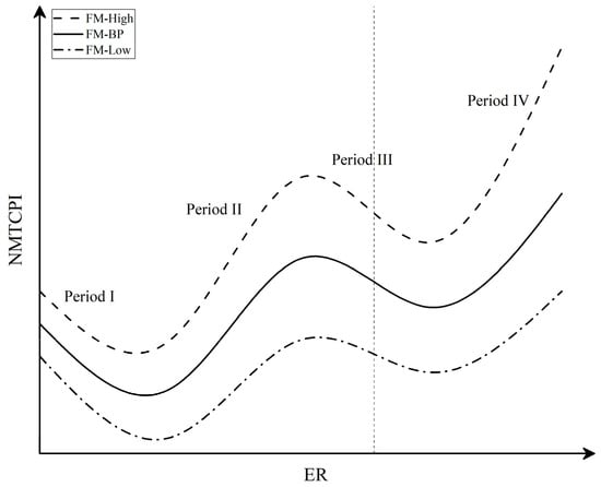 Combined with Figure 2, we next analyse the superposition effect of the EFMA in the process of ER affecting the NMTCPI. In the early stage of ER policy implementation (the first stage), enterprises advance carbon emissions reduction by increasing investment in clean technology. However, with insufficient ER supervision and enterprises’ low returns on investment, enterprises will bear fewer fines or carbon taxes and be disinclined to alter the production mode of high pollution and high energy consumption, resulting in a decline in the NMTCPI. In addition, the initial ER stage is not full-scale, industry-wide joint development but selective pilot development. Industries or regions that are not participants in ER pilots are aware of their significance and will inevitably adopt more extensive production methods to increase clean production capacity, resulting in a short-term NMTCPI increase. The relative decline verifies the ER compliance cost effect. If the EFMA is low at this time (distorted factor market), the inhibitory effect of the factor market is superimposed with that of ER, further reducing the NMTCPI. In contrast, high EFMA will promote carbon emissions performance, but ER inhibits factor marketisation and the NMTCPI, exhibiting a stronger inhibitory effect than a pulling effect, with a downward trend in carbon emissions. The pulling effect of factor marketisation on the NMTCPI has caused the decline in carbon emissions performance to be lower than that of factor distortion.