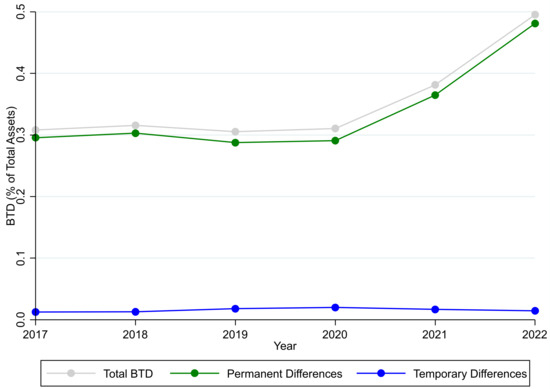 However, it should be noted that BTD does not simply arise from a passive interaction between accounting and tax-based income definitions. As emphasized by Graham et al. [10], BTD is also a function of managerial behavior, including tax planning and earnings management, which appear increasingly complex as business affairs and market globalization become progressively sophisticated [54,55,56]. As a result, efforts to reduce the size of BTD have become increasingly intricate, considering the need for in-depth identification of the underlying causes. In this regard, Tsang and Firth [9] and Graham et al. [10] suggest decomposing BTD into two components, namely temporary and permanent differences.