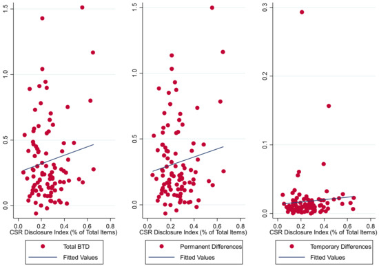 A large body of literature on tax accounting shows the usefulness of those two BTD components in detecting two business activities that are considered less ethical, namely tax planning and earnings management [57,58,59,60,61,62,63]. Companies employ diverse tax planning strategies, such as adjusting the timing of income and expenses, to effectively defer revenue recognition and hasten expense deductions for tax purposes [8]. This deliberate approach allows entities to minimize their current tax liabilities while optimizing future tax benefits. Consequently, tax planning can influence the magnitude and duration of temporary differences between accounting income and taxable income, impacting financial reporting and tax obligations [64]. Although it only produces temporary differences, if a company can generate net new temporary differences consistently over time through ongoing tax deductions, such as engaging in CSR-related activities [65,66], then the impact will be more permanent [49].