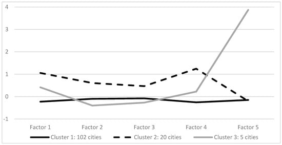Next, we used the obtained factor scores to determine the appropriate number of clusters. For this purpose, we used K-means cluster analysis. In this way, we were able to identify a relatively homogenous group of cases, in our case cities, characterized by similar capacities for the provision of local public services []. So, input variables are factor scores, which indicate the extent to which each city has a high score on a group of characteristics that have a high loading on a relevant factor. For maximum efficiency, the method for classifying cases was updating cluster centers iteratively. We started with the minimum possible number of clusters (2). However, in this case, univariate F tests from the ANOVA were not statistically significant for all clustering variables, indicating that the difference between the two clusters was not significant. On the other hand, by increasing the number of clusters to three, we were able to obtain significant differences between clusters. Hence, we were able to group cities in our analysis into three different clusters.