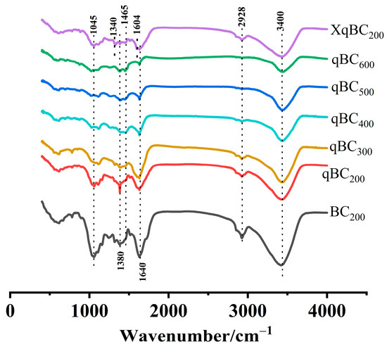 The elemental compositions of the biochars are listed in Table 1. The carbon and oxygen contents of the untreated bitter melon vines were 40.97% and 41.65%, respectively, reducing to 38.25% and 36.20%, respectively, after steam explosion. Under steam explosion, the high-temperature hydrolysis of acetyl groups in hemicellulose possibly releases some acidic small molecules that destroy the glycosidic bonds in hemicellulose, partially hydrolyzing them to monosaccharides and oligosaccharides with the loss of carbon and oxygen elements [28]. The H/C ratio reflects the aromaticity magnitude of biochar, with smaller ratios indicating stronger aromaticity. Meanwhile, the O/C and (N + O)/C ratios reflect the hydrophilicity and polarity magnitudes, respectively, with larger ratios indicating stronger hydrophilicity and polarity, respectively [29,30]. The H/C ratios of qBC200 and BC200 pyrolyzed at the same temperature were similar, indicating similar aromaticity values of the biochars obtained from the two treatment methods, and the O/C and (N + O)/C ratios of qBC200 were slightly smaller than those of BC200. The H/C, O/C, and (N + O)/C ratios of the biochars prepared from steam-explosion-treated biomass gradually decreased with increasing pyrolysis temperature, indicating that increasing the pyrolysis temperature enhances the aromatic structure of the biochar surface. Meanwhile, the decreased polarity and weakened hydrophilicity indicate the partial removal of polar functional groups.