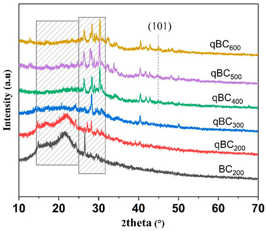 Figure 3 shows the XRD spectra of the different biochar samples. The broad diffraction peaks near 14–25° in the spectra of BC200 and qBC200 are the characteristic diffraction peaks of disordered carbon, indicating an amorphous carbon structure in BC200 and qBC200 [36]. In the spectrum of qBC300, the amorphous carbon peaks shifted from those of qBC200 and the characteristic peaks of calcium oxalate, calcium carbonate, and organic monomer crystallization (e.g., GA cellulose) appear, indicating the thermal dissociation of long-chain polymers into organic monomers and inorganic salts that interact with the amorphous carbon. Increasing the carbonization temperature accelerated the water loss and thermal decomposition in the sample, as evidenced by the sharpening of the characteristic peaks (i.e., enhancement of crystallinity). The (101) peak around 45° in the XRD spectra of the qBC400, qBC500, and qBC600 samples corresponds to graphite-ordered carbon, suggesting that the interaction between the crystals and amorphous carbon also increases with temperature, increasing the orderliness of the biochar [37].