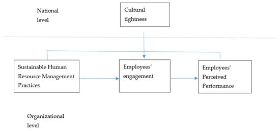 In an era characterized by rapid globalization and heightened environmental consciousness, organizations are increasingly compelled to align their business practices with the sustainable development goals. Among these practices, Sustainable Human Resource Management (SHRM) has emerged as a pivotal element influencing organizational performance [1,2,3]. SHRM integrates the triple bottom line of economic, social, and environmental considerations into human resource (HR) practices, fostering a workforce that is not only efficient but also ethically attuned and environmentally conscious [4,5,6]. The main objective of this study is to explore the impact of Sustainable Human Resource Management on employees’ performance, focusing on the mediating role of employee engagement and the moderating effect of national culture, specifically cultural tightness–looseness. The research problem addresses how SHRM practices influence performance across different cultural contexts and how employee engagement mediates this relationship.