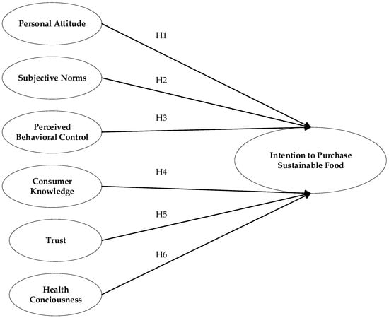 The present study can be distinguished from previous studies by focusing on the evolution of the TPB in the context of sustainable food consumption. Moreover, particular attention was given to Generation Z (Gen Z), also called post-Millennials, who are individuals born in 1995 or later [17], and are increasingly influential in the marketplace. Gen Z exhibits greater impulsiveness in purchasing behavior compared to older cohorts. Conversely, the buying decisions of Generation Z are frequently influenced by hedonistic motives and are price-sensitive; yet Generation Z also displays a high awareness of environmental conservation issues in contrast to older generations [18,19]. Understanding their motivations and intentions regarding sustainable food consumption is essential for devising effective interventions and policies aimed at promoting sustainable consumption patterns and fostering environmental and public health. Prior studies have also examined consumption of sustainable food products, suggesting that Generation Z consumers are driven by a combination of product attributes, perceived value, and sustainability considerations when making purchasing decisions related to sustainable food products [20,21,22,23,24]. However, there is a scarcity in the discourse surrounding consumer knowledge, trust, and health consciousness, which seem to be crucial to achieving sustainable consumption. Considering this gap, the current study adds to the existing literature by offering new insights into consumer behavior regarding sustainable food. To provide a deeper insight, it is crucial to consider the TPB model, a widely accepted framework for understanding consumer behavior. Through the examination of the interplay between health concerns, consumer knowledge, trust, and the core components of TPB (personal attitude, subjective norms, and perceived behavioral control), this paper provides a comprehensive view of the factors influencing sustainable food purchase intentions. Through the examination of these variables, this research aimed to present a more comprehensive understanding of how the core components of the TPB and health concerns, consumer knowledge, and trust can shape intentions to purchase sustainable food.