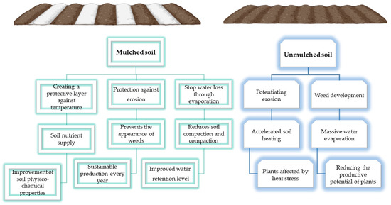 Mulching with both organic and inorganic materials is one of the alternative weed control techniques that can be used to retain water in the soil. Mulching is primarily used to retain soil moisture by inhibiting weed growth and preventing surface water evaporation. Mulching also helps control temperature fluctuations; enhances the physical, chemical, and biological properties of the soil; and, lastly, increases orchard biodiversity [18,19,20]. Figure 2 lists these additional benefits of mulching. To achieve steady and reliable yields, tree crops require the benefits of mulching [21].