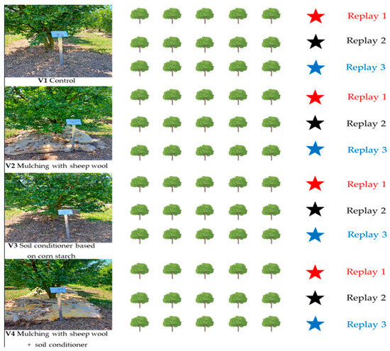 On 15 April 2023, the experimental variants (Variants 3 and 4) were installed by adding the conditioner to the soil. These were followed by sheep wool mulching (Variants 2 and 4), with Variant 1 serving as the control and being linear on 5 trees/variant of plum trees × 3 repetitions (Figure 4). The conditioner was applied by deep loosening the soil to a depth of 25 cm using a modified scarifier equipped with a bucket to administer 100 g of conditioner granules per tree. Next, 20 cm of sheep wool mulch was spread on each side of the row, with a width of 80 cm.