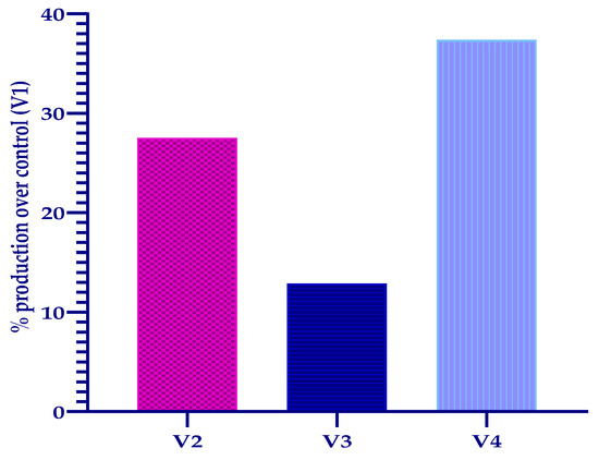 The highest increase in production compared to the control was recorded in V4 (37.35%), followed by V2 (27.49%) and V3 (12.87%), an aspect shown in Figure 5.