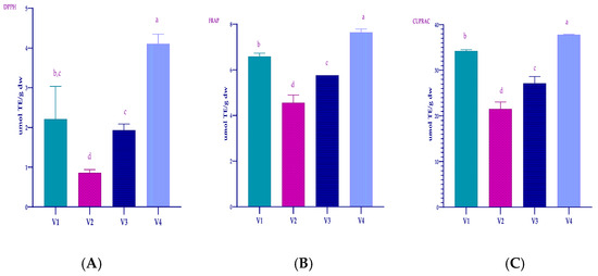 Antioxidant capacity of plum fruits determined by the DPPH (A), FRAP (B), and CUPRAC assays (C). The results represent the means ± SD (n = 3). Different lowercase letters represent the differences between samples, with significance at the p < 0.05 level. V1, control; V2, mulching with sheep wool; V3, soil conditioner based on corn starch; V4, mulching with sheep wool + soil conditioner. DPPH—2,2-Diphenyl-1-picryl-hydrazyl-hydrate, FRAP—ferric reducing antioxidant power, CUPRAC—cupric reducing antioxidant capacity, and TE—equivalent Trolox.