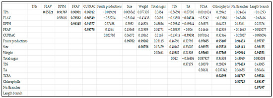 A highly significant positive correlation was observed between the total phenol content (TPh) and all antioxidant capacities examined (Figure 8). As a result, the FRAP and CUPRAC had a 0.98 correlation, and the DPPH had a 0.91 Pearson correlation. Furthermore, there was a significant positive correlation (r = 0.85) between TPh and total flavonoid. Figure 8 depicts a highly significant positive correlation between TCSA, branch length and number, and chlorophyll content and also with fruit yield, weight, and size.