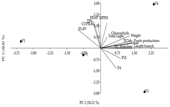 Principal component analysis of total polyphenols, antioxidant capacity, and quality indicators of Stanley plums after the application of sheep wool mulching (V2), corn starch-based polymers (V3), a combination between them (V4), and the control (V1). TPh—total phenol content, FLAV—total flavonoid content, DPPH—2,2-Diphenyl-1-picryl-hydrazyl-hydrate, FRAP—ferric reducing antioxidant power, CUPRAC—cupric reducing antioxidant capacity, TSS—total soluble solid, TA—titratable acidity, and TCSA—trunk cross-sectional area.
