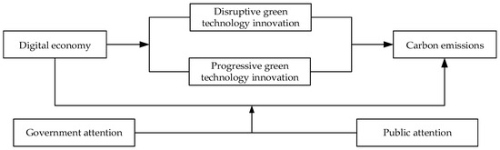 Innovation in technology stands as a pivotal approach to combat climate change and to advocate for the diminution of carbon emissions [11,12], and is also an important driving force for achieving the sustainable development goals. Green technology innovation aims to further integrate low-carbon environmental protection considerations into technological innovation. With the implementation and practice of sustainable development goals, people worldwide have recognized the significant practical importance of green technology innovation. Compared to other types of technological innovation, the role of green technological advancements in curbing carbon emissions is notably pronounced. Augmenting green technological innovation within urban conglomerates can expedite economic expansion and foster industry growth in a clustered, interconnected and environmentally sound manner [13]. With global environmental problems becoming more prominent, green technology innovation is imperative [14,15]. A multitude of academicians have substantiated the mitigating influence of green technological innovation on carbon emissions [16,17], a pattern that is evident across the N-11 (N-11 countries include: Bangladesh, Egypt, Indonesia, Iran, Korea, Mexico, Nigeria, Pakistan, Philippines, Turkey and Vietnam) [18] nations, G7 countries (the G7 includes the United States, Britain, France, Germany, Japan, Italy and Canada) [19], Singapore [20] and BRICS nations [21]. However, there is a dearth of research that delves into green technological innovation from a dual innovation perspective. The theory of dual innovation is rooted in the dual characteristics of organizations. According to the different degrees of innovation, scholars divide dual innovation into two types: breakthrough innovation and progressive innovation [22]. Following this logic, green technology innovation can also be bifurcated into disruptive and progressive types, each distinguished by its unique attributes [23]. Disruptive green technology innovation, or “from zero to one” innovation, involves assimilating new knowledge and applying new technology to achieve innovation. This represents a profound revolution of the original technology, requiring high levels of innovation conception and resource integration. Progressive green technology innovation, or “adding bricks and mortar”, involves the improvement and growth of existing green technology. This type of innovation is less demanding in terms of the capabilities and resources of the innovator [24]. The integration of both radical and incremental green technological innovations is essential for refining the energy matrix and effecting a comprehensive societal shift towards low carbon footprints. Simultaneously, the growth of the digital economy and carbon emissions are strongly linked to public and government attention [25,26]. In Europe and the US, public governance has increasingly been incorporated into environmental governance models due to the growing severity of environmental issues and rising public awareness of environmental protection. In China, this model is still in its initial stage. Questions such as “why carry out environmental pluralistic governance” and “at which level should the center of gravity of environmental pluralistic governance be placed” continue to emerge.