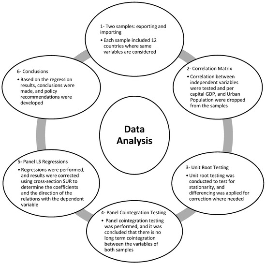 Panel cointegration testing was performed for both samples and based on the augmented Dickey–Fuller results, it was concluded that there was no long-term cointegration between the variables for the sample of oil exporters, with a p-value of 0.1365; the null hypothesis that there is no cointegration is retained. Similarly for the oil importers sample, the augmented Dickey–Fuller test resulted in a p-value of 0.7961, also indicating no cointegration between the variables.
