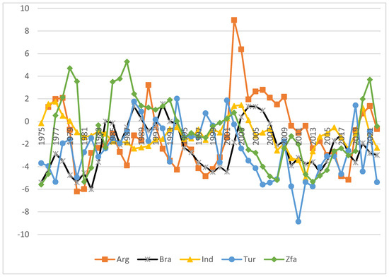 Some episodes support this view in the BASIT (Brazil, Argentina, South Africa, India, and Türkiye) countries. (See Figure A1 in the Appendix A) Growth rates exceeded 1% in Brazil in 2018 and 2019. However, the growth rate turned negative, and the current account deficit was reduced to almost 59% in 2020. After COVID-19, the current account deficit increased with an increase in growth rate. The same argument can also be applied to the Indian economy. Indeed, the deficit turned into a surplus in 2020. After the economic crisis in 2001, Türkiye experienced high growth rates for 5–6 years, while the current account deficit hit records levels. With the 2008–2009 crisis, there was a serious decrease in the current account deficit as a result of the economic contraction, but with the expansion of the economy in the following years, the current account deficit tended to increase again.