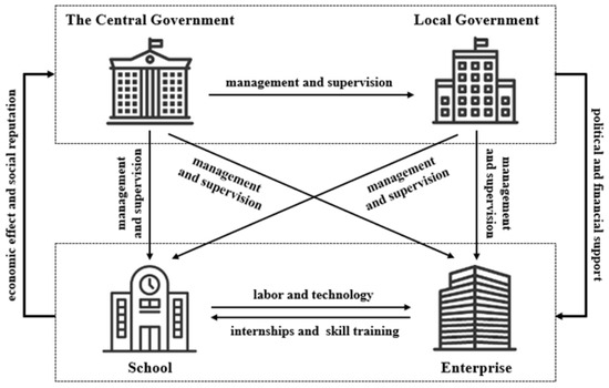 Schools and enterprises are the cores of this quadrilateral game. Schools benefit from cooperation with enterprises through enhancements of discipline construction, talent cultivation, and teacher development. Similarly, enterprises gain advantages such as access to cheap but high-quality labor, opportunities for technological innovation, and improved social standing through cooperation with schools. Governments play the roles of regulation and supervision in school–enterprise cooperation by promulgating relevant policies and providing financial support to push schools and enterprises to cooperate with each other. In return, the cooperation between schools and enterprises is more effective because of the government’s involvement, which will provide more outstanding talents, better economic development, and higher social reputations for governments. In addition, local governments are required to implement the policies of the central government and are managed by the central government. The relationship between schools, enterprises, the central government, and local governments is shown in Figure 1.