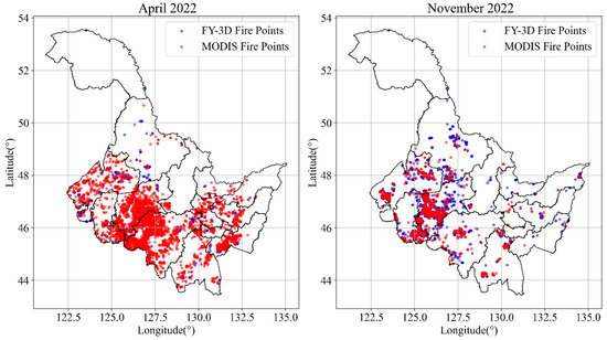 Spatial comparison of Fengyun-3D fire points and MODIS fire points in April and November 2022, Heilongjiang Province, China.