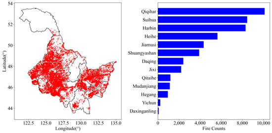 Distribution map of cropland fire points and number of fire points in each city in Heilongjiang Province from 2015 to 2023.
