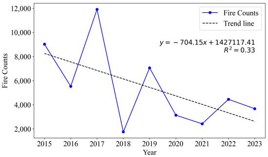 Changes in the fire counts of croplands in Heilongjiang Province from 2015 to 2023.