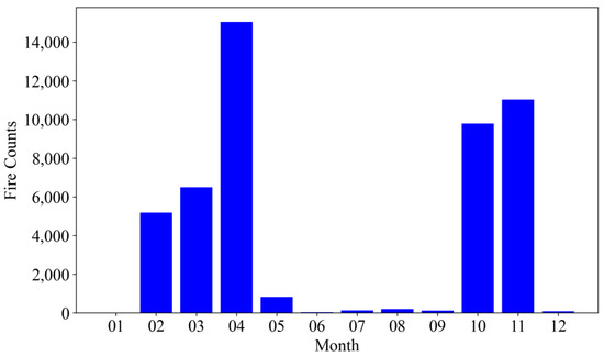 Figure 4 depicts the average monthly distribution of crop fire incidents between 2015 and 2023, highlighting a prominent peak in April and a substantial uptick starting in October, culminating in a second peak in November. The number of fire points in February–April and October–November accounted for 54.6% and 42.5% of the whole year, respectively. The two periods exhibiting increased fire incidents corresponded with the spring and autumn plowing seasons, respectively. The observed pattern of fire activity, with minimal occurrences from May to September and significant rises in the months of intensive farming practices, suggested a strong linkage between agricultural activities and the frequency of crop fires.