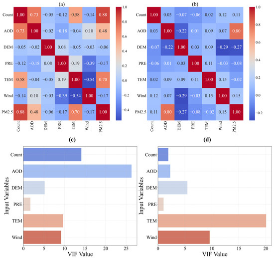 Correlation coefficients and variance inflation factors (VIFs) of input variables in (a,c) temporal and (b,d) spatial models.